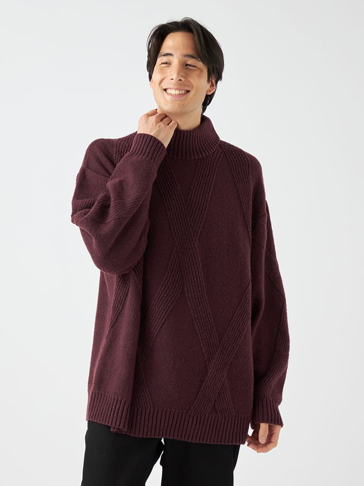 - ダイヤ柄ニットハイネック長袖セーター