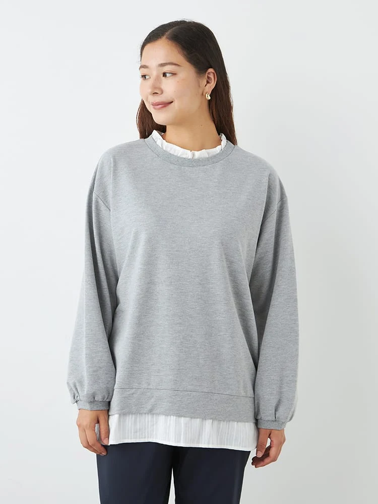 ブラウスに、スウェットを重ね着しているようなルックスが1枚で完成。