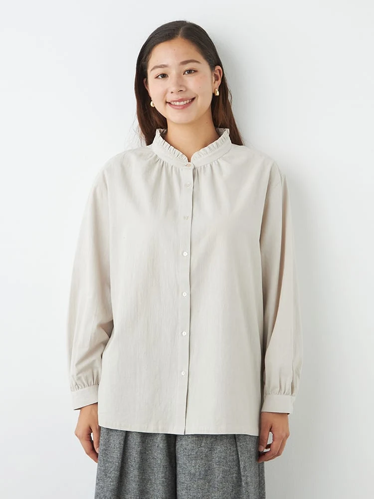 細かなフリルをあしらった襟がさりげなく甘さをプラスしてくれる長袖シャツ。
