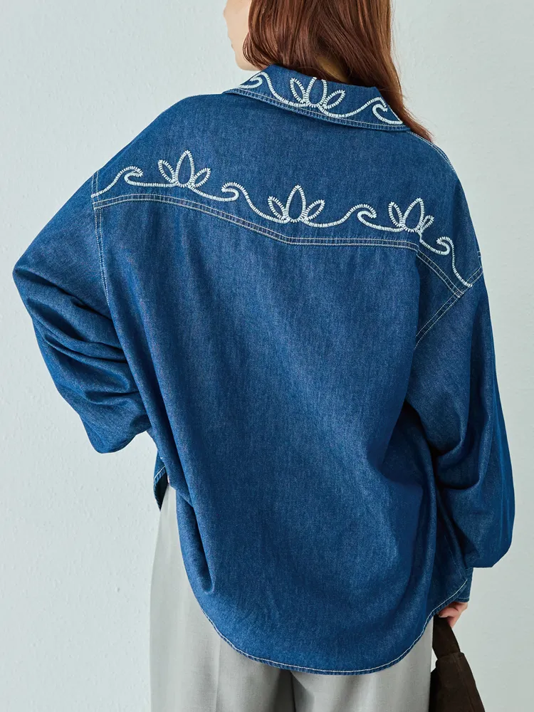 程よい厚みのデニム素材に、繊細な刺繍をあしらった大人カジュアルなシャツ。