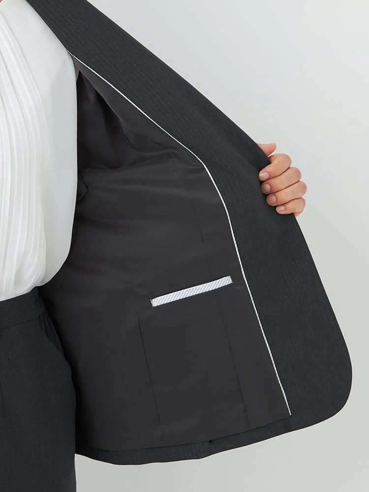 シャドーストライプの柄のベーシックな2ボタンジャケットで上品な印象に。