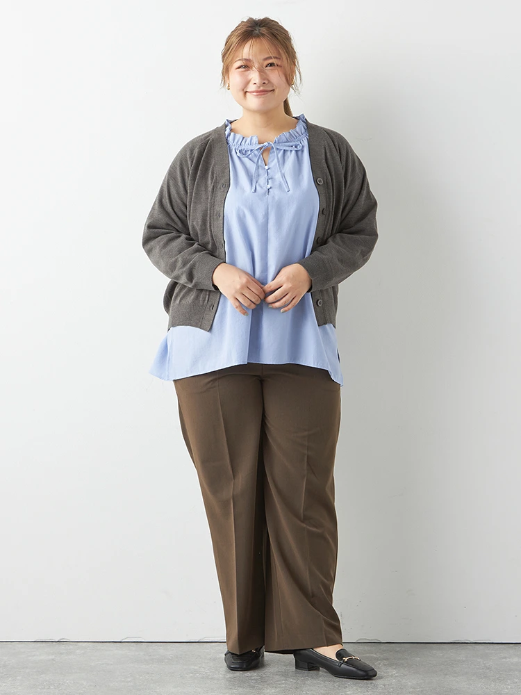 スカートにもパンツにもワンピにも合わせやすい万能カーデ。