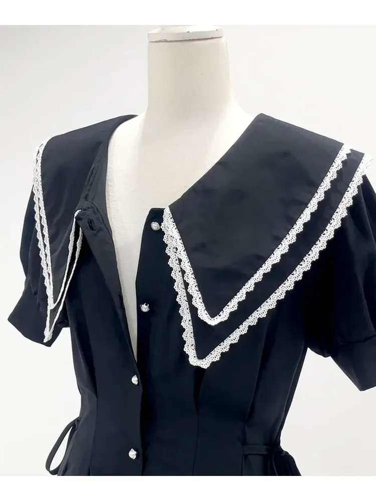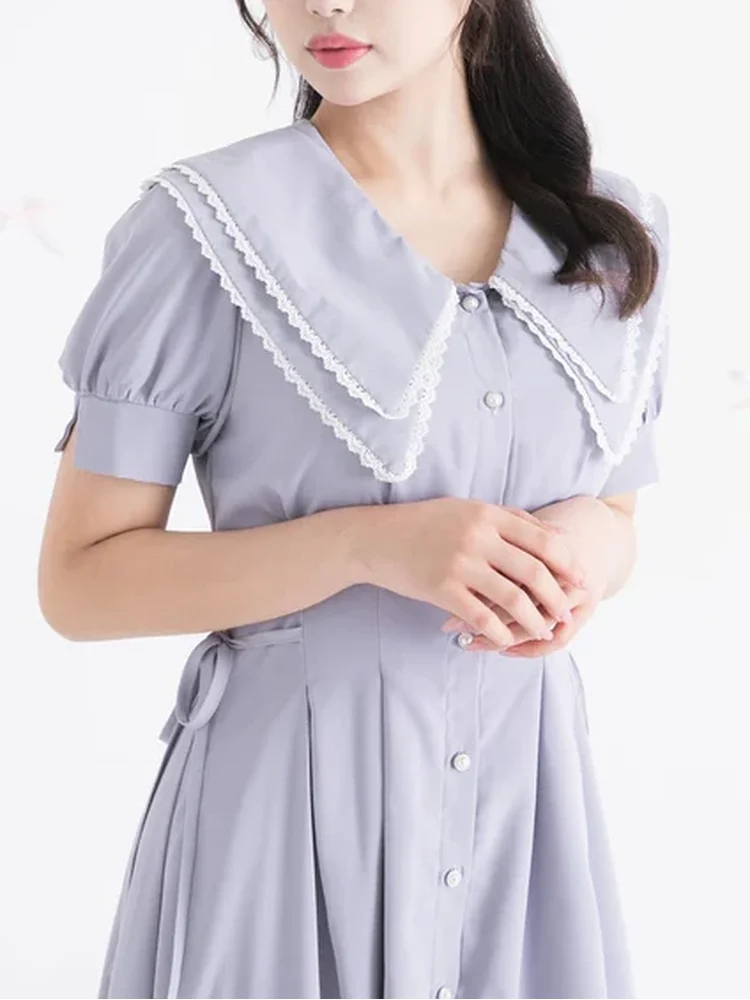襟の縁にあしらったスカラップレースは、クラシカルなムードを演出します。