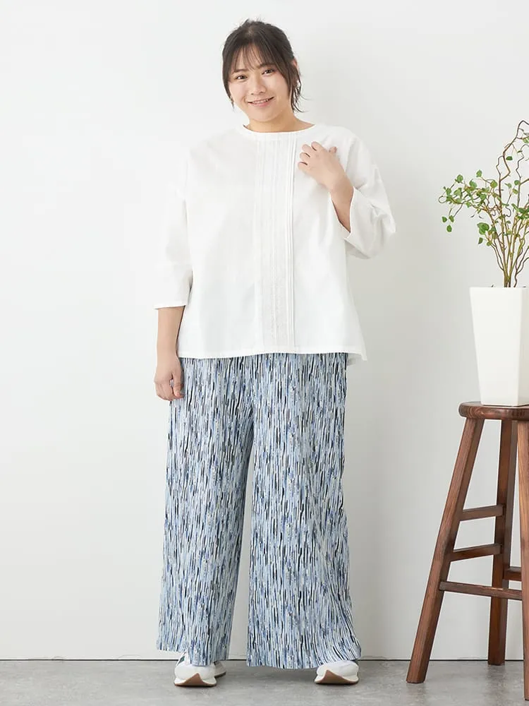 中央にタックやレースをあしらって、華やかに仕上げた7分袖シャツです。