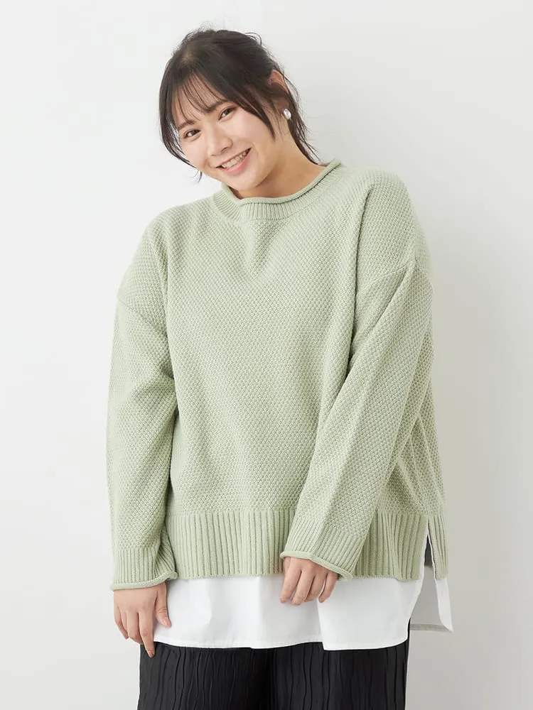 裾から別生地がのぞく、レイヤード風デザインの鹿の子編みセーターです。
