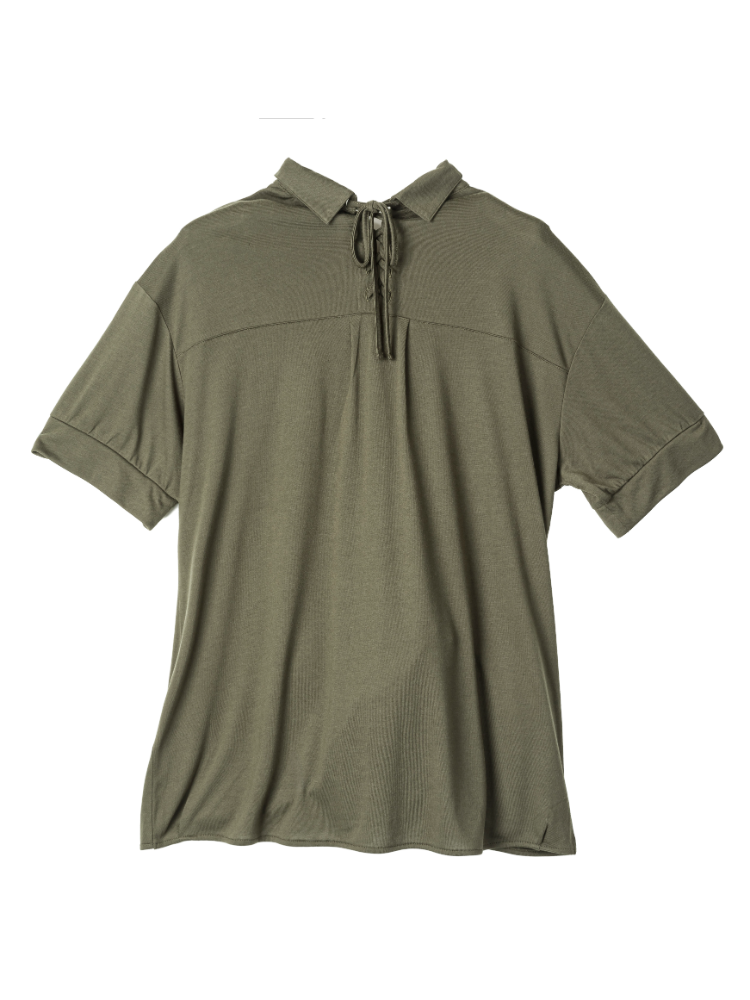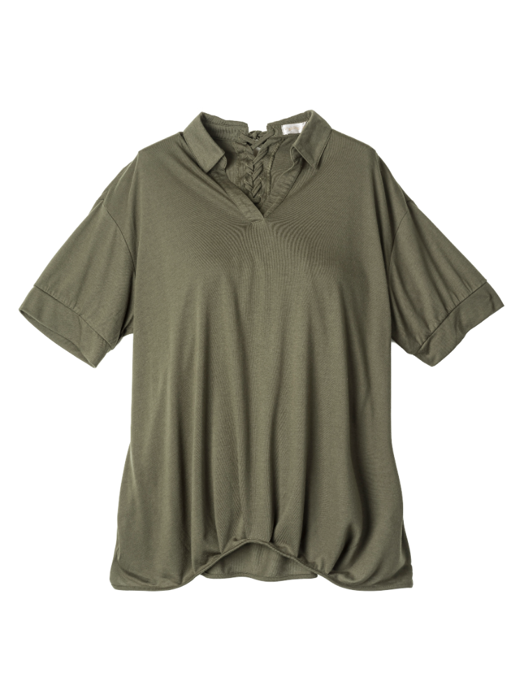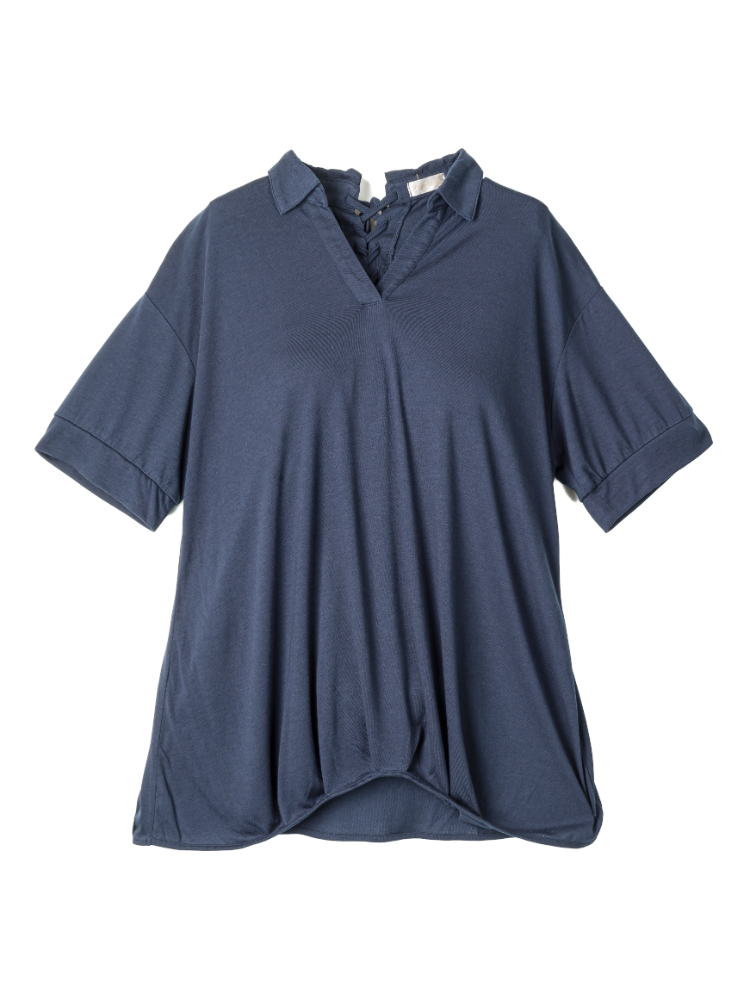 大きいサイズのレディス襟付きスピンドル使いのスキッパーです。天竺素材を使用し、襟付きスピンドル使い裾タック使いがポイントです。お手入れは洗濯機で洗えます。