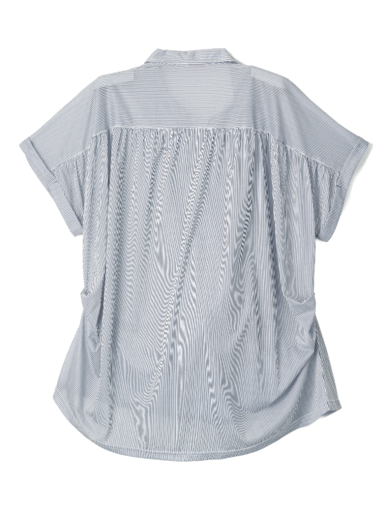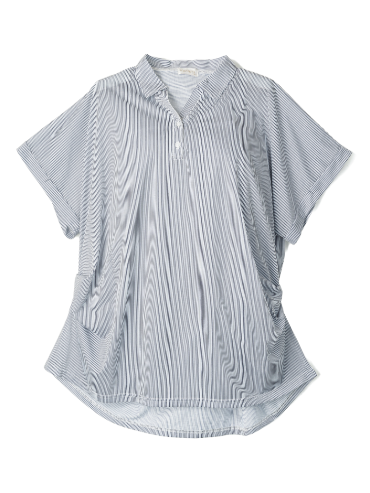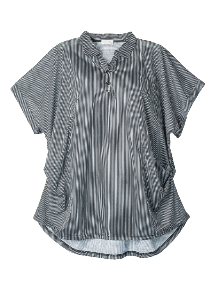 大きいサイズのレディス襟付きストライプのチュニックです。紡績糸を使用し張りのある素材で布帛見えするカットソーです。襟付きで裾タックデザインがポイントです。お手入れは洗濯機で洗えます。ドルマン風でゆったりデザインなので体型カバーも出来ます。