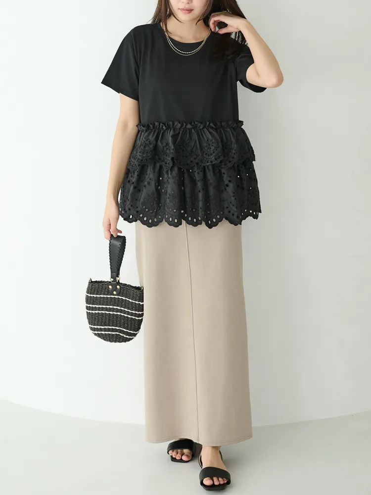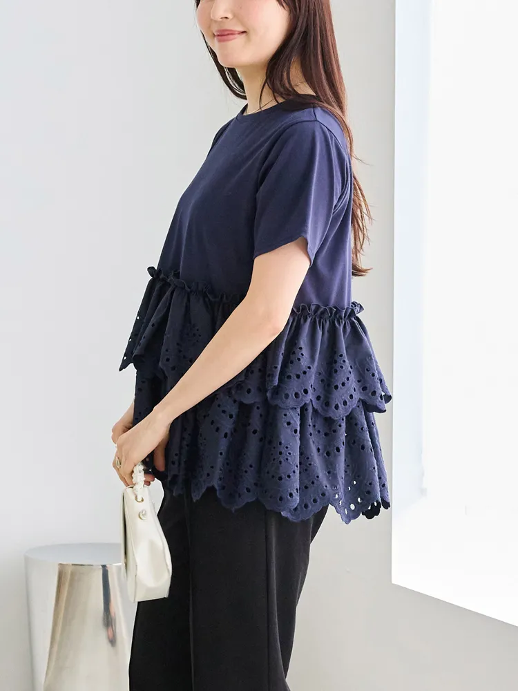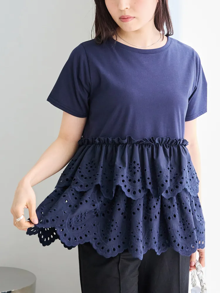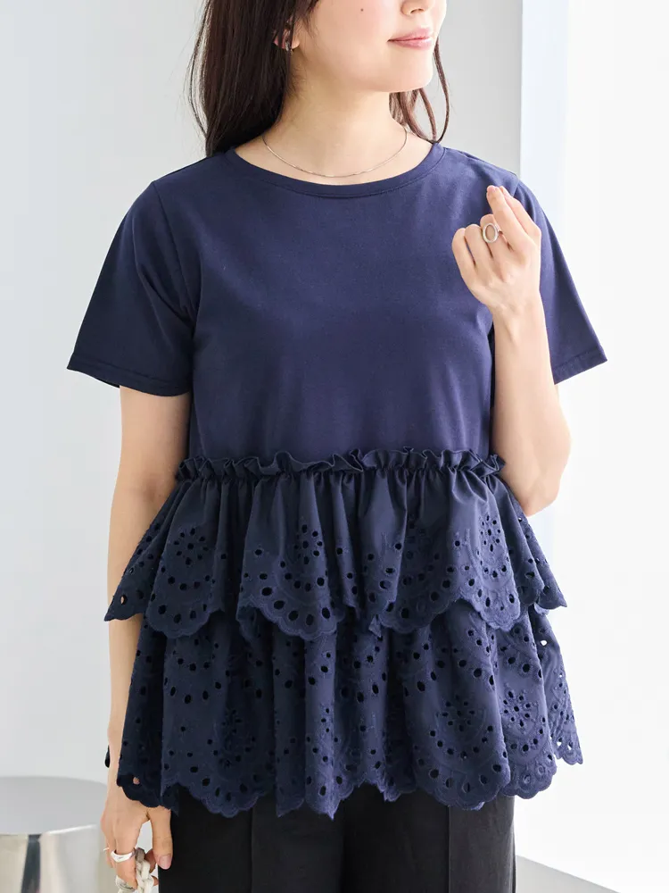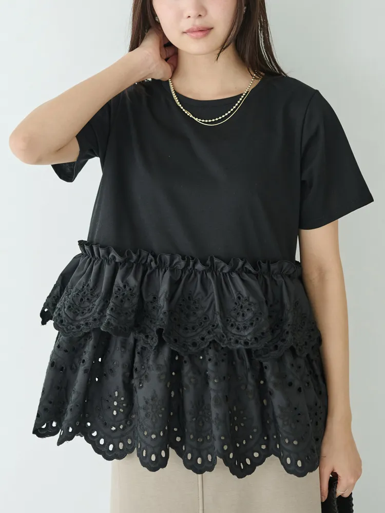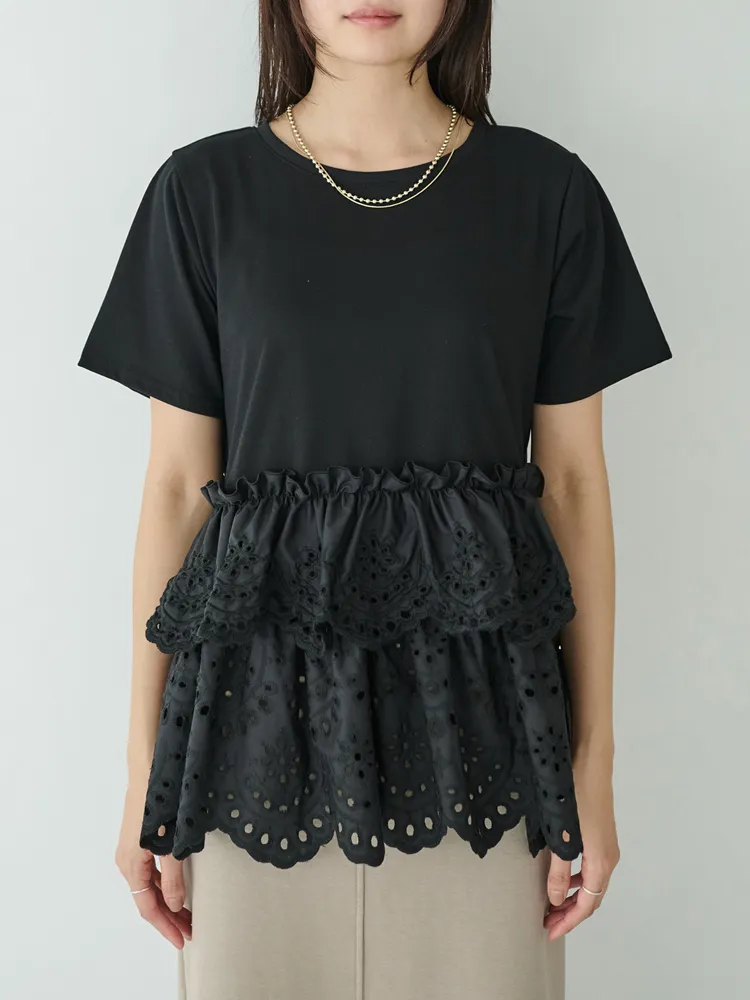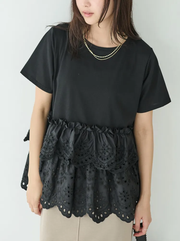 きれいめな生地感のTシャツにナチュラルな風合いの刺?レースをドッキングしたデザイン。ふんわりと揺れる2段になったティアードで立体感のあるシルエットに。バスト下から切替ているので、スタイルアップ効果も期待できます。切替部分のさりげないフリルもポイントです。