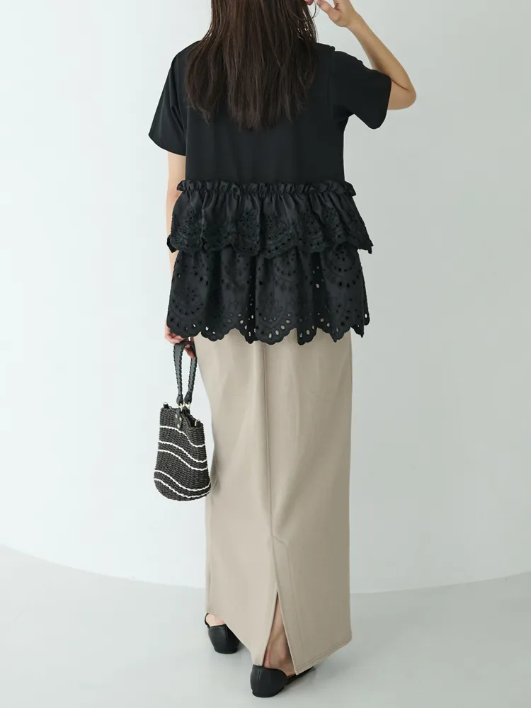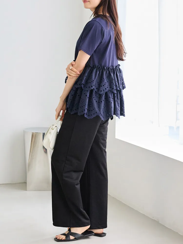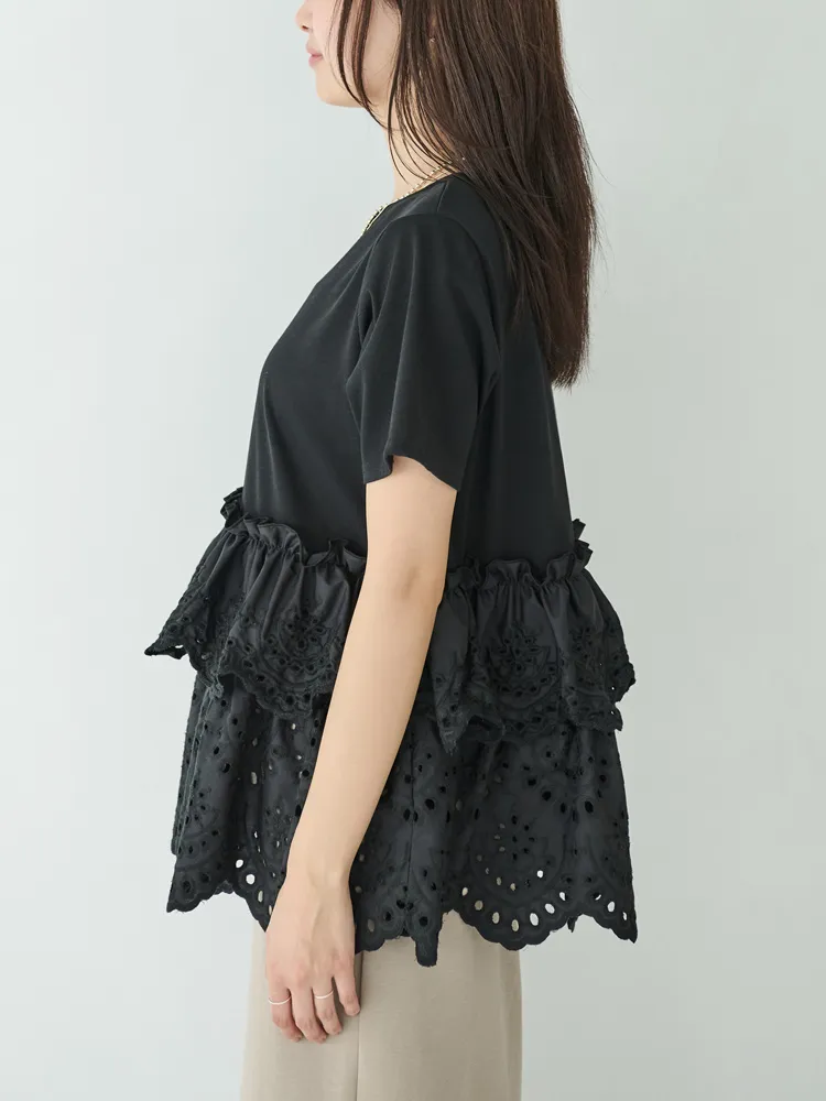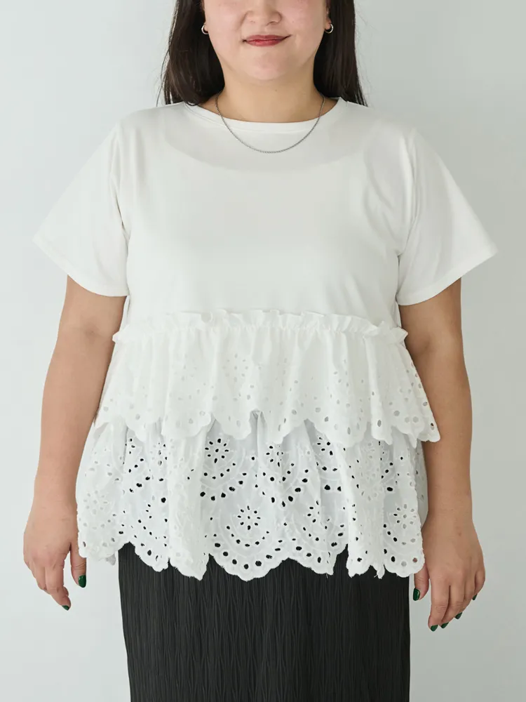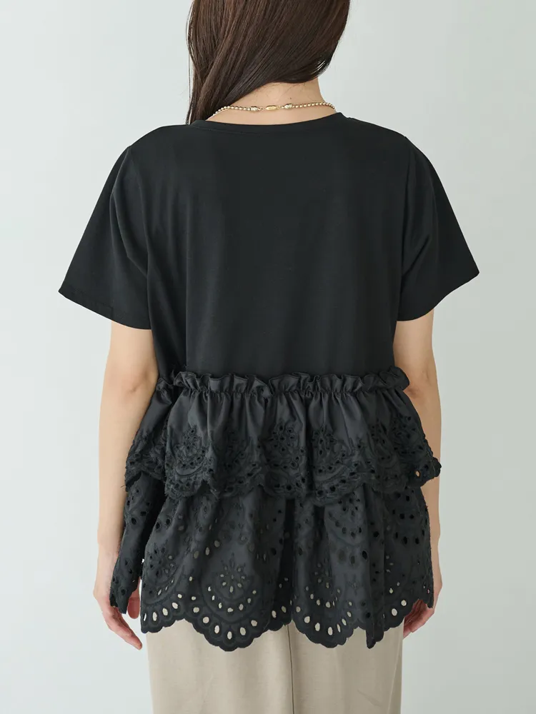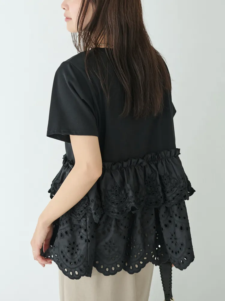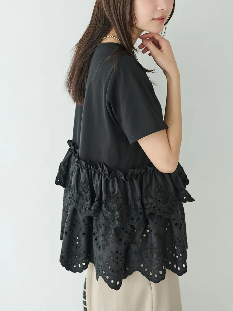 きれいめな生地感のTシャツにナチュラルな風合いの刺?レースをドッキングしたデザイン。ふんわりと揺れる2段になったティアードで立体感のあるシルエットに。バスト下から切替ているので、スタイルアップ効果も期待できます。切替部分のさりげないフリルもポイントです。