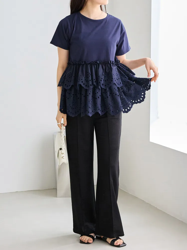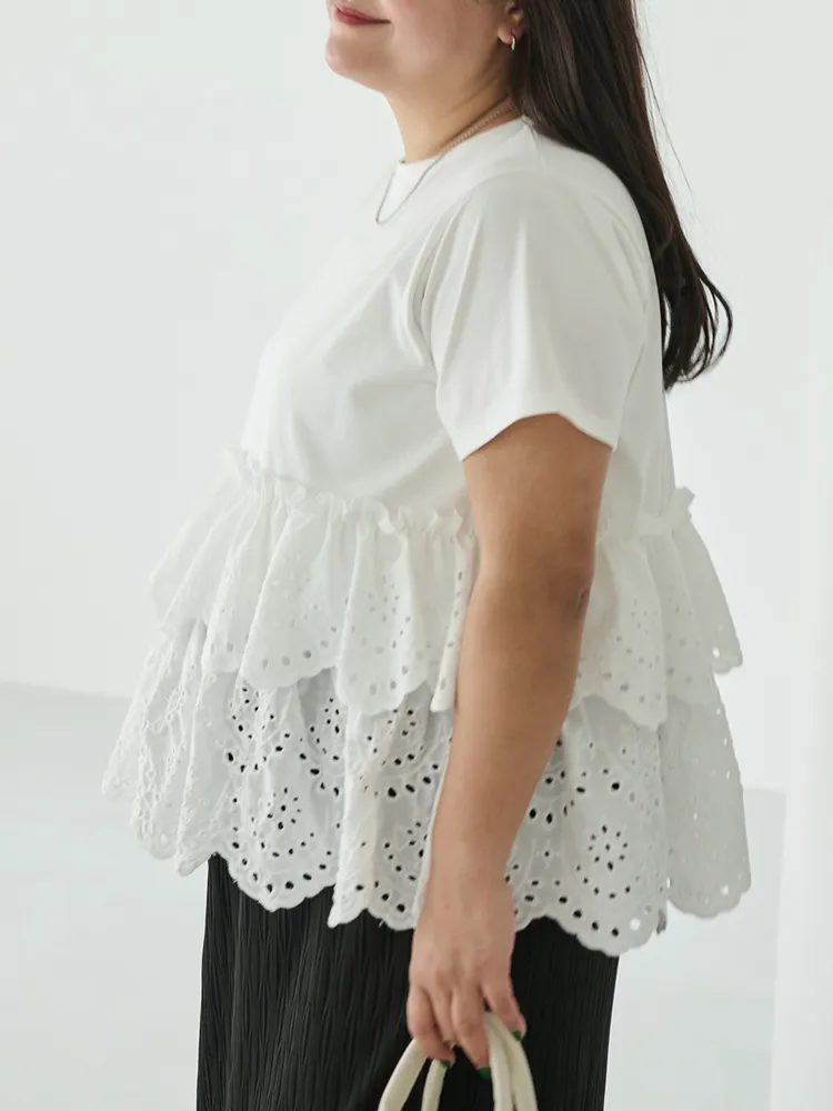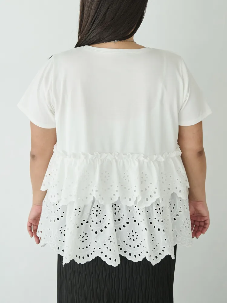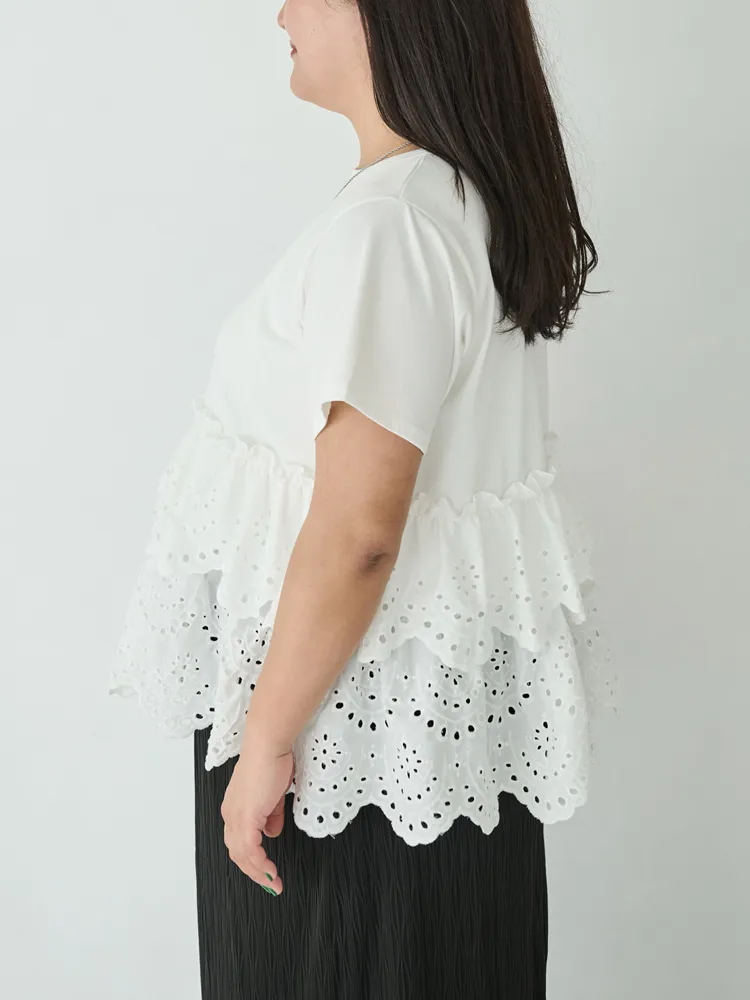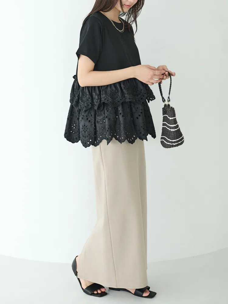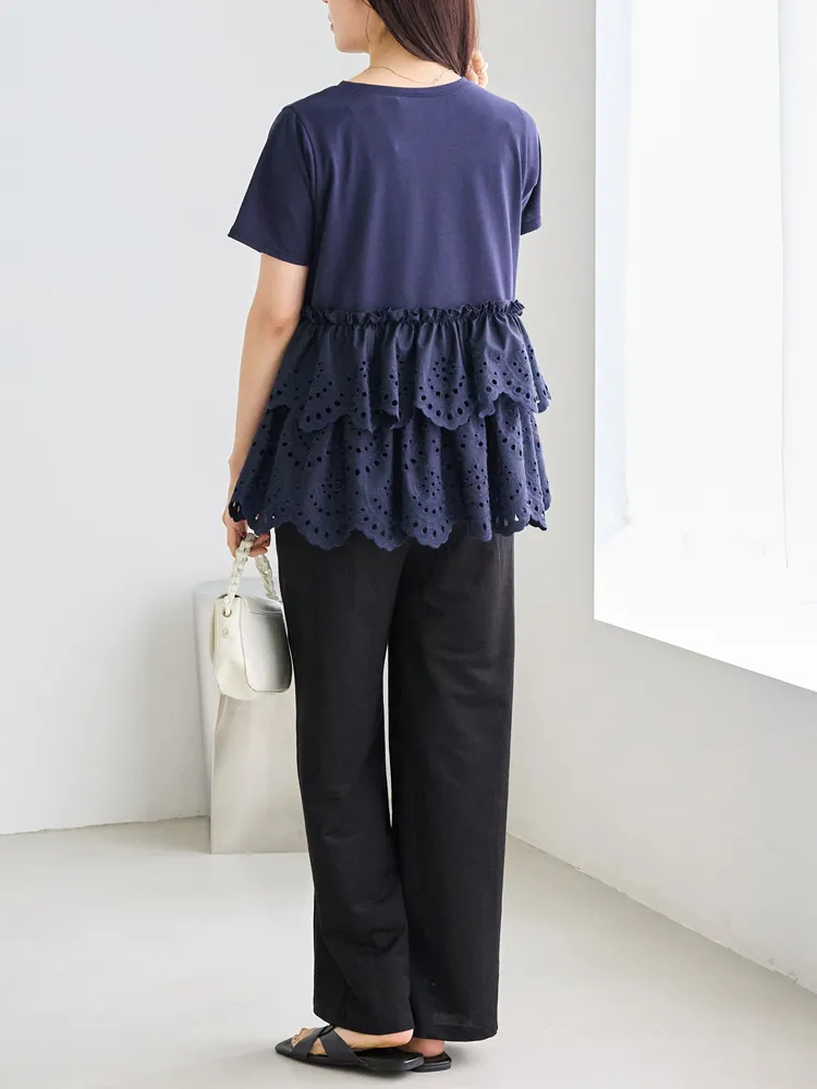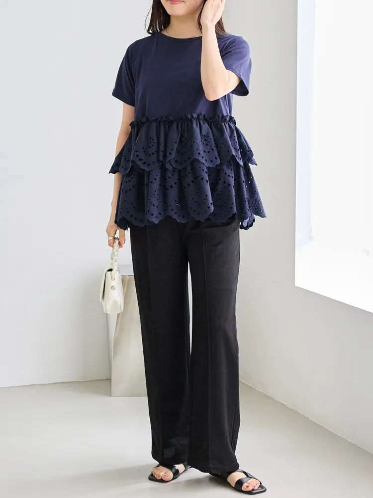 きれいめな生地感のTシャツにナチュラルな風合いの刺?レースをドッキングしたデザイン。ふんわりと揺れる2段になったティアードで立体感のあるシルエットに。バスト下から切替ているので、スタイルアップ効果も期待できます。切替部分のさりげないフリルもポイントです。