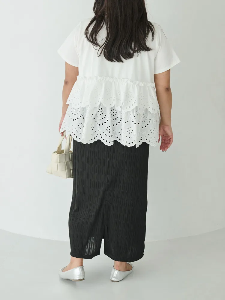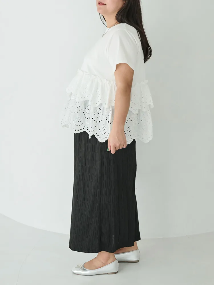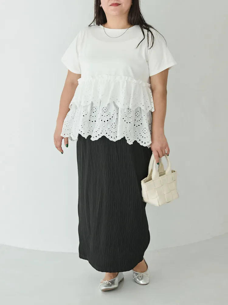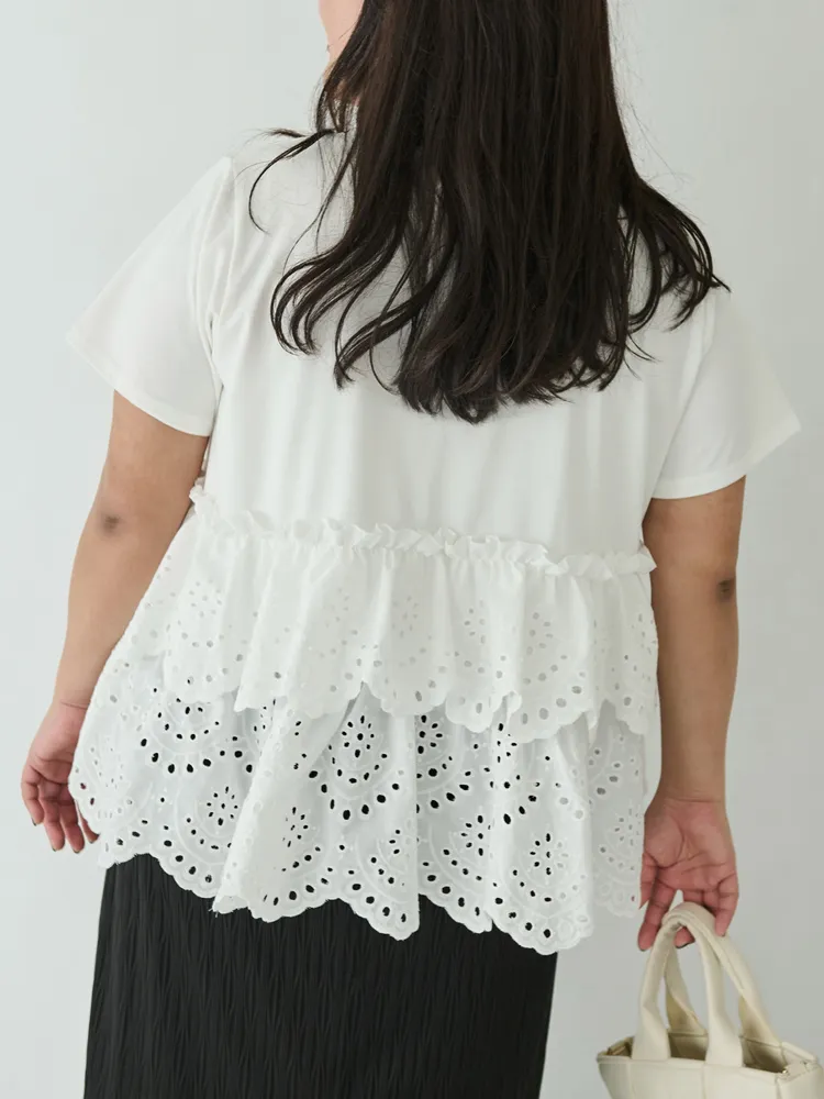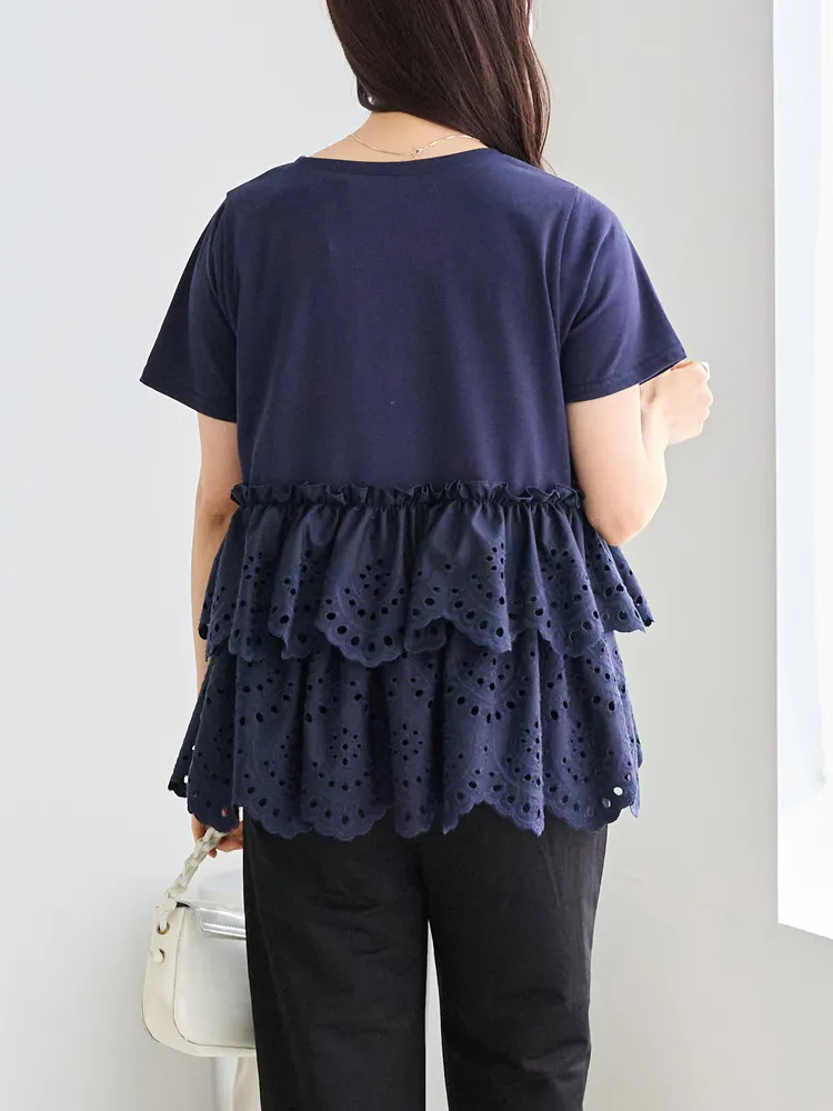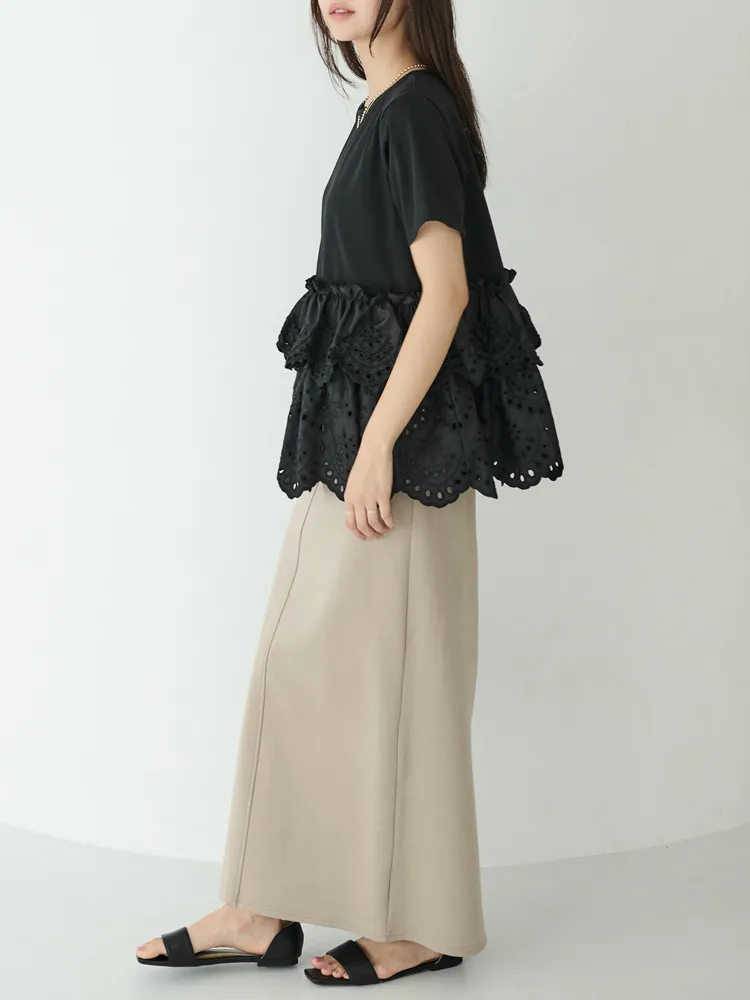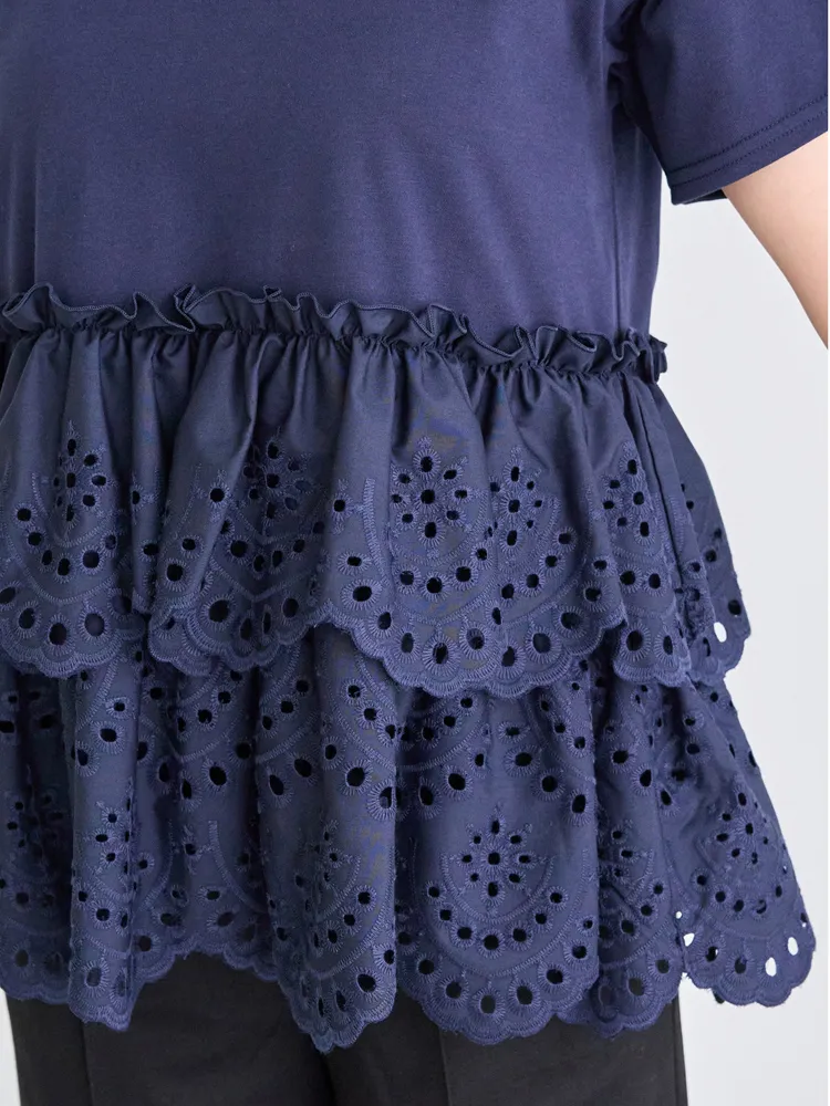 きれいめな生地感のTシャツにナチュラルな風合いの刺?レースをドッキングしたデザイン。ふんわりと揺れる2段になったティアードで立体感のあるシルエットに。バスト下から切替ているので、スタイルアップ効果も期待できます。切替部分のさりげないフリルもポイントです。