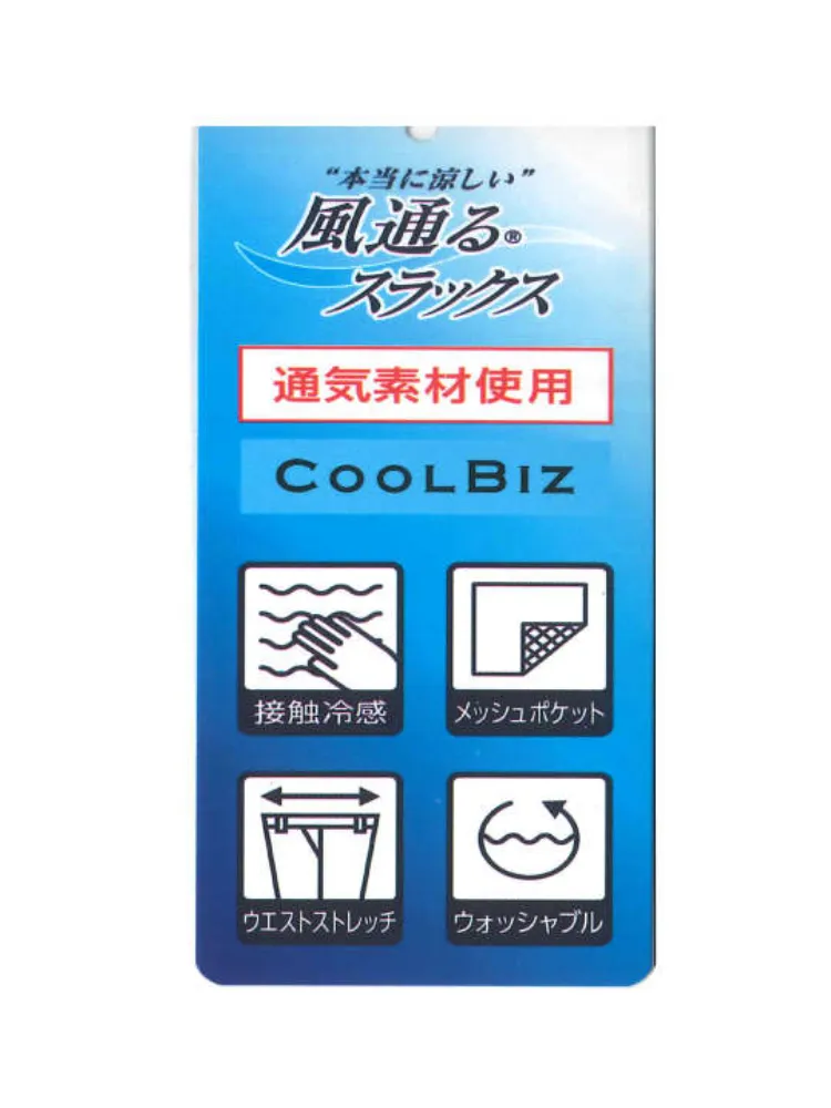 前開きファスナー/サイド・バックポケット有/メッシュポケット/メッシュ腰裏地/ウォッシャブル/ベルトループ8本/ウエストストレッチ/ストレッチ/接触冷感