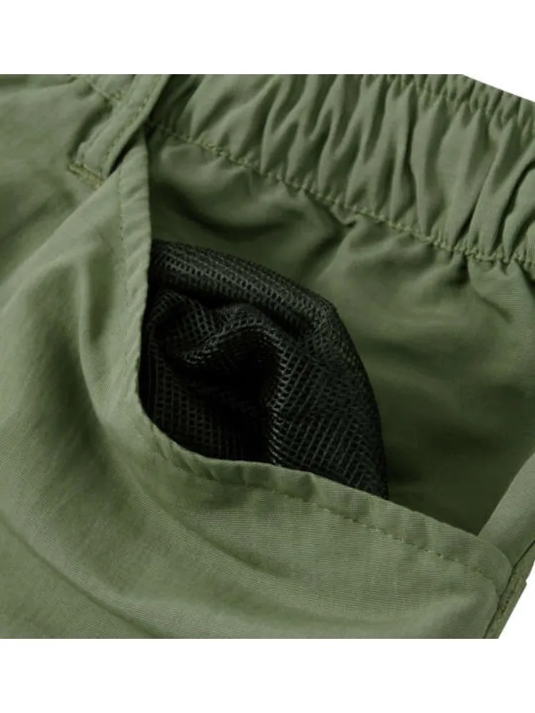 前開きファスナー/サイドポケット(裏地メッシュ仕様)・バックポケット(マジックテープ・ゴムループ付き・水抜きハトメ穴有)/ベルトループ7本/ウエストシャーリング(調節紐有)/スナップボタン/刺繍/紫外線カット/接触冷感/水陸両用
