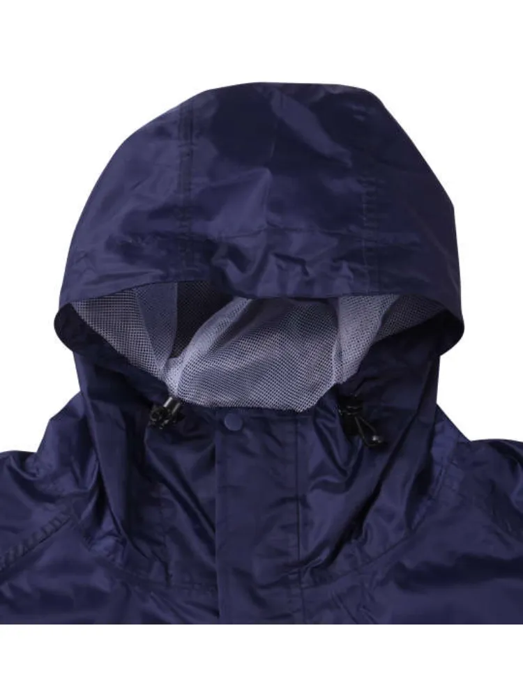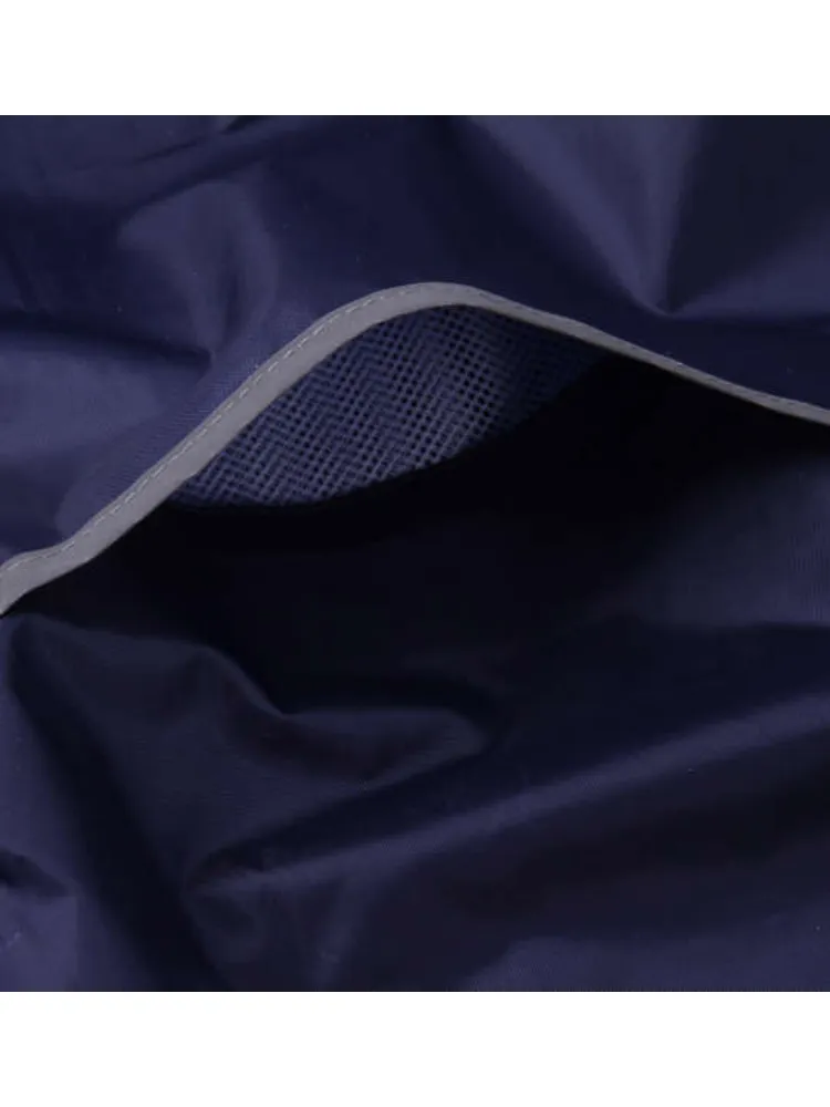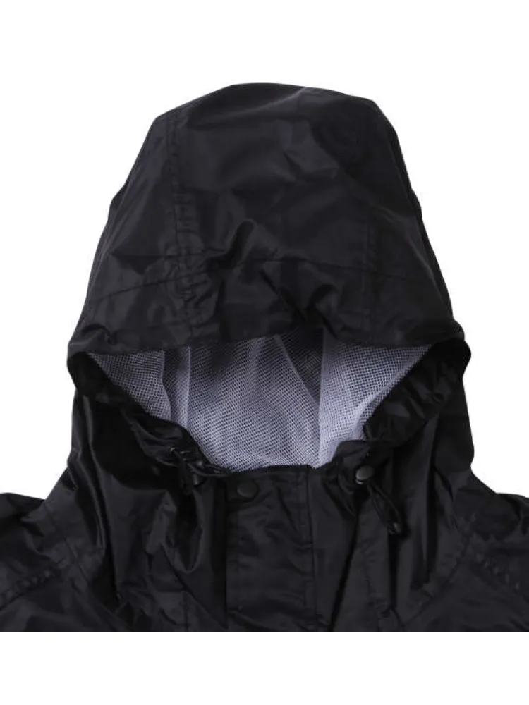 パンツ(前閉じ)/ウエストシャーリング(調節ひも有)/袖口(マジックテープ調節有)/パンツ裾口(2段階ボタン調節)/フード取外し不可(調節ひも有)/トップス(サイドポケット有)/背抜きベンチレーション有/収納ポーチ付/比翼仕立て/裏側マイクロメッシュ/はっ水/バック再帰反射テープ