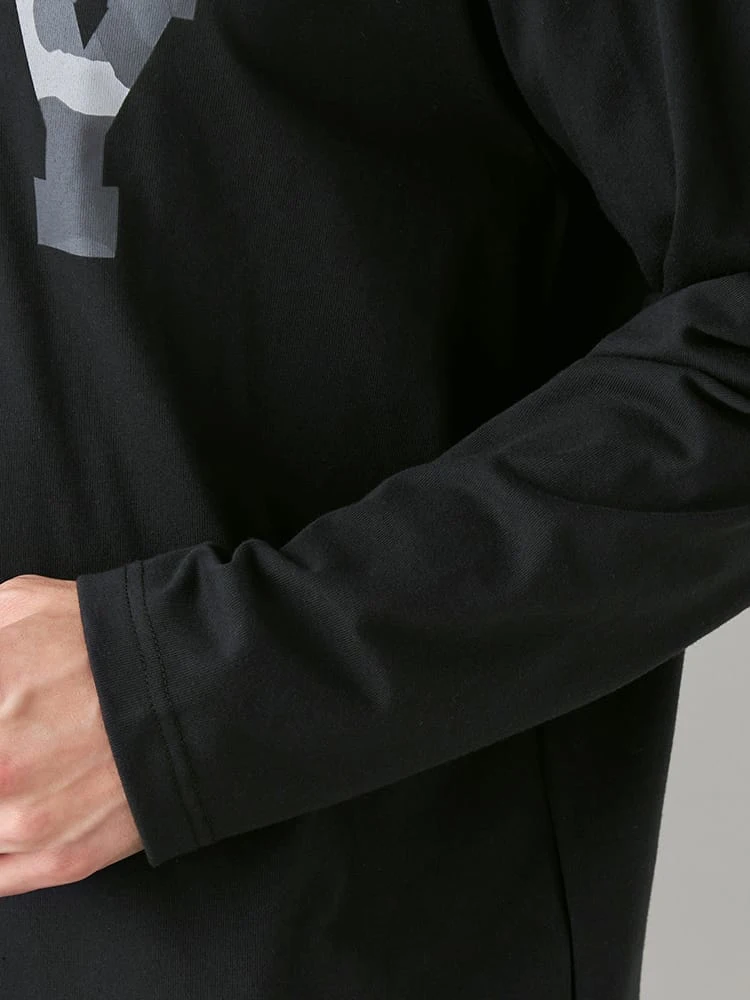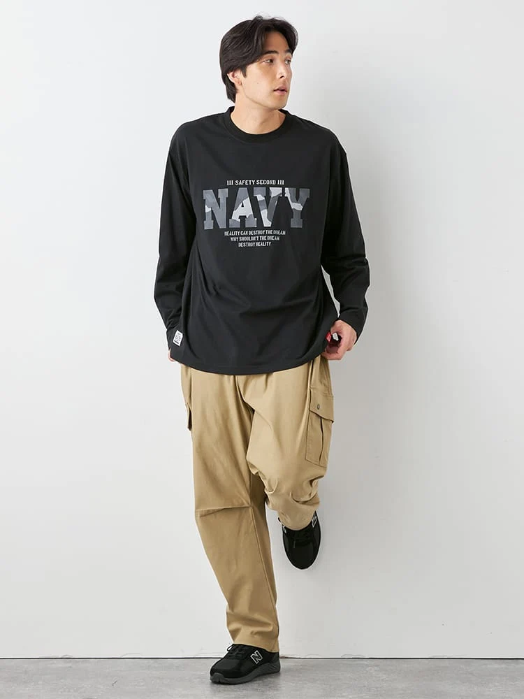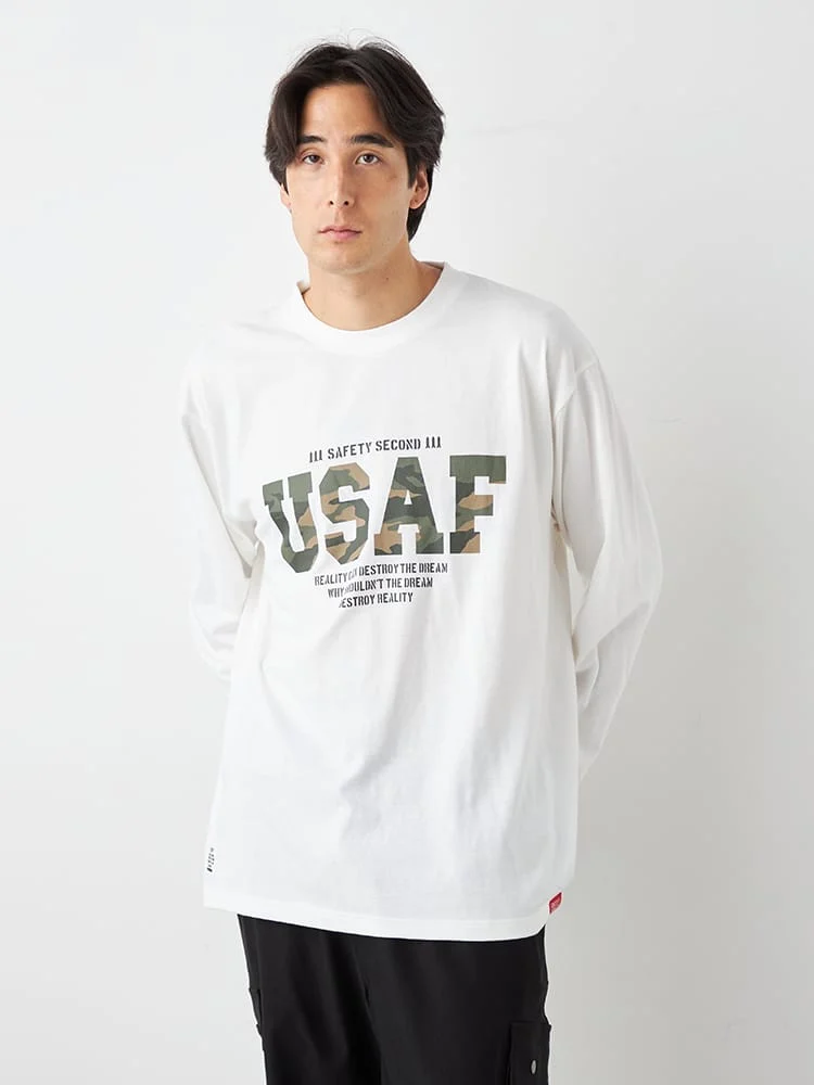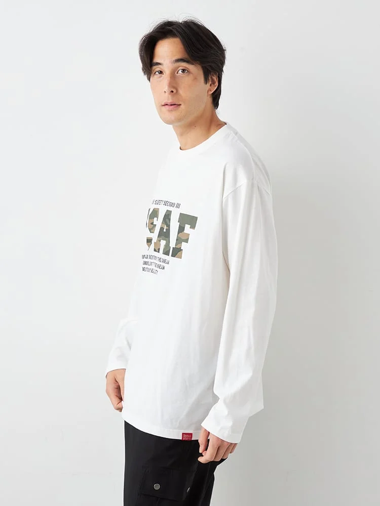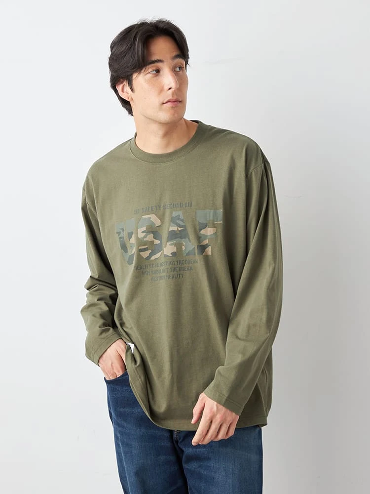 ミリタリーワードのプリント内が迷彩柄になった長袖Tシャツ。
