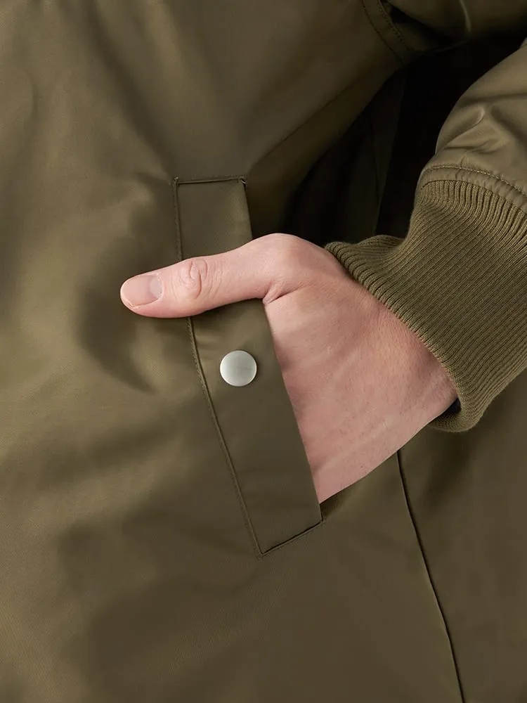 高密度300Tツイルの表地に保温性中綿、アルミファスナー、大きなミリタリーワード刺繍仕様といったこだわりのディテール内容。