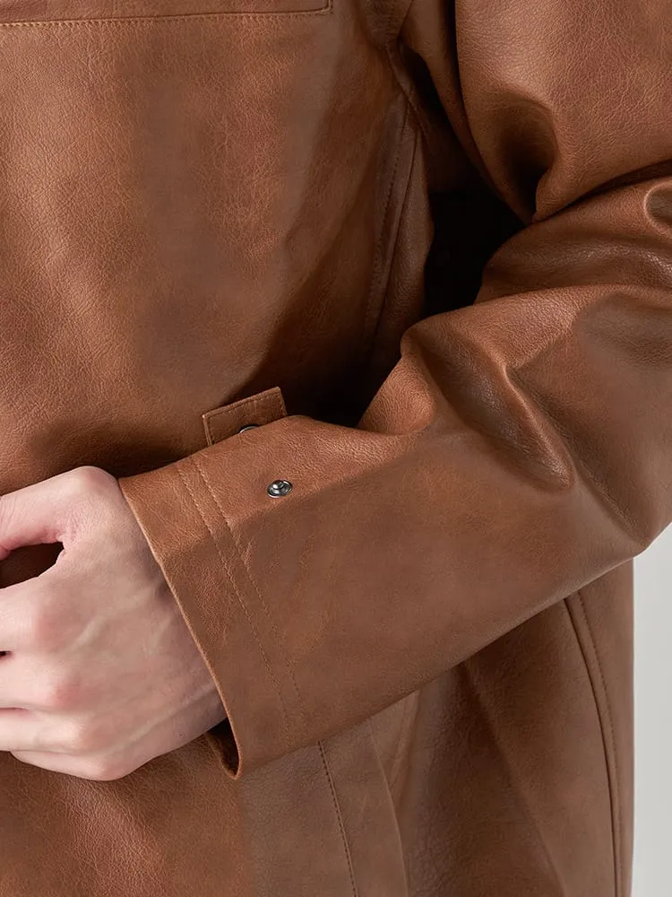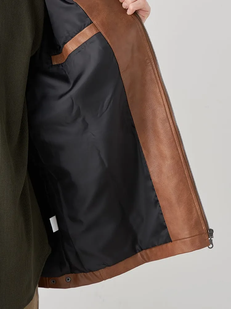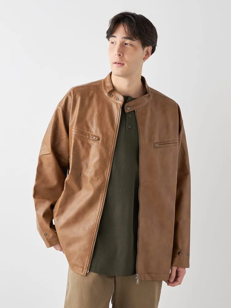 大きいサイズの 合成皮革ライダースジャケットです。カウレザー調の筋が入った革っぽい表面感が特徴で、アンティーク調スタイルの合皮ブルゾンです。シンプルなシングルライダーススタイルなので、ジーニングカジュアルはもちろん、ストリートスタイルのコーディネートでも活躍してくれます。