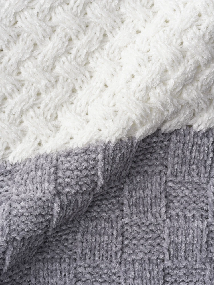 膨らみ、柔らかさ、あたたかさを併せ持つモール素材をベースに、大胆な切替配色のデザインセーターです。