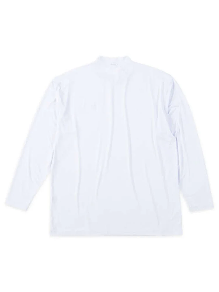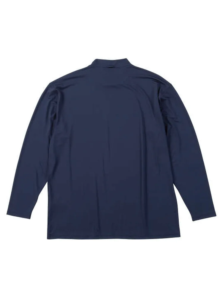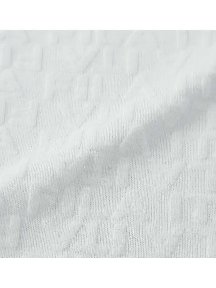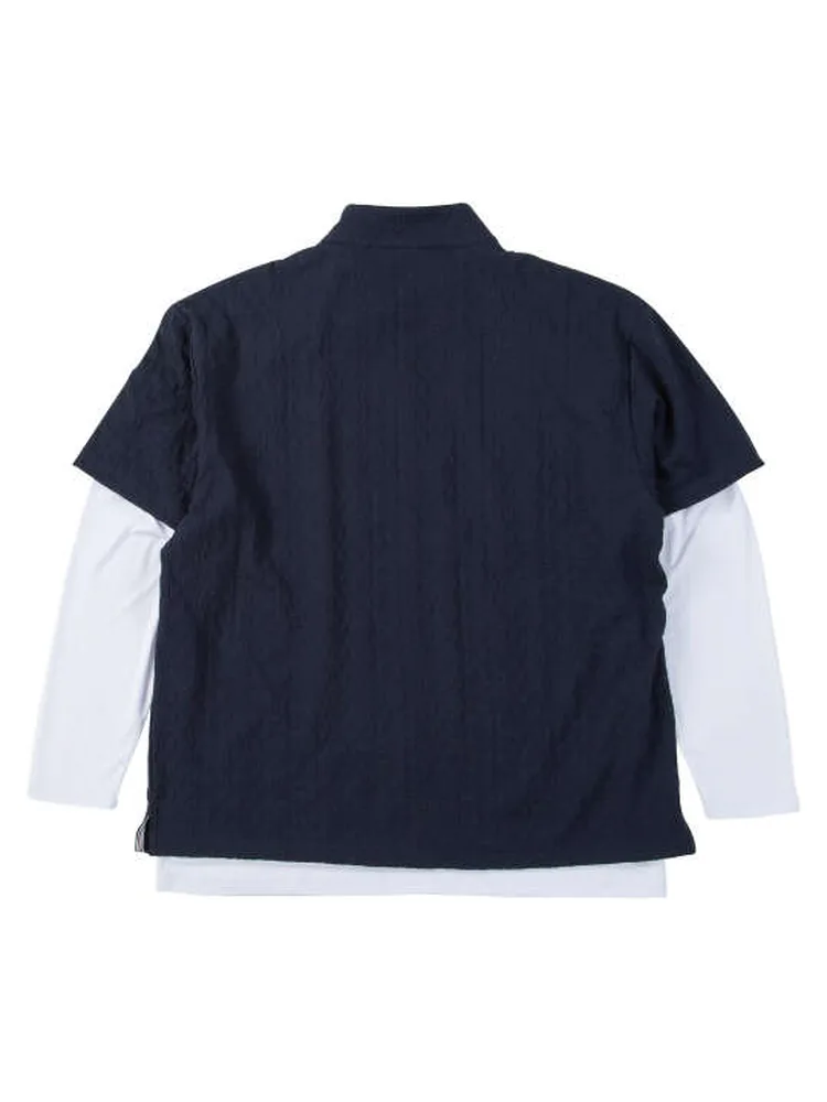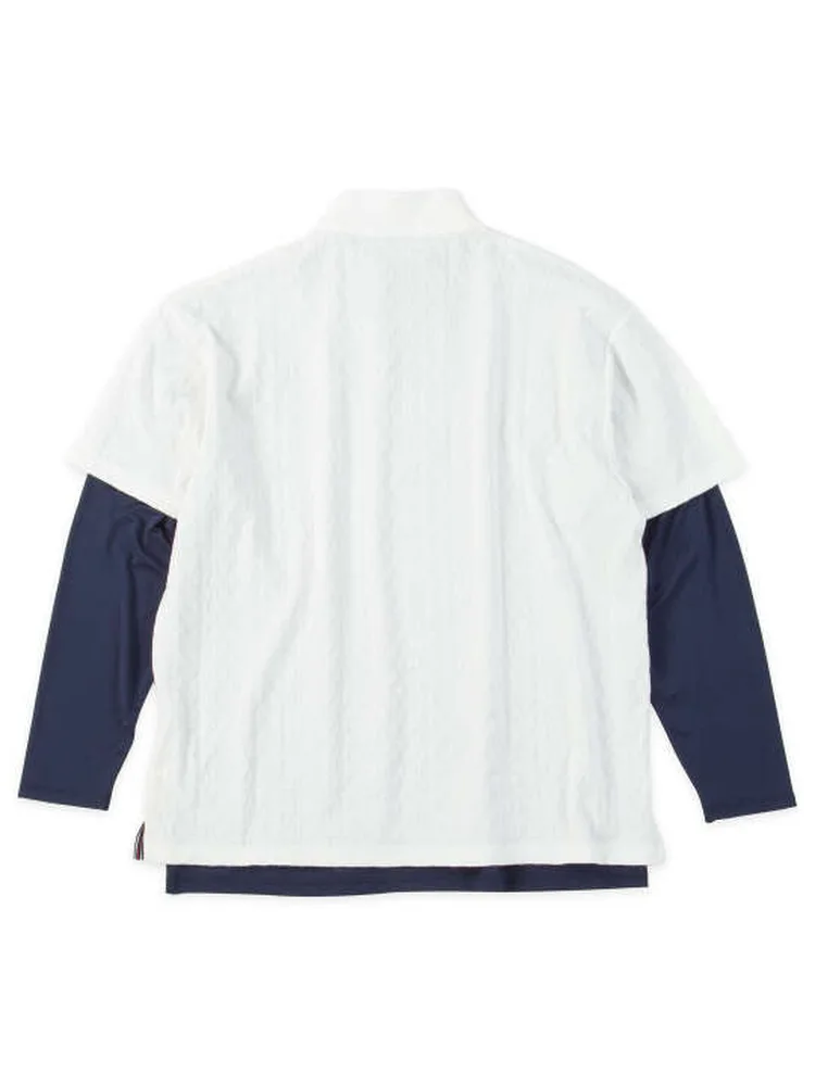 立体的な3Dジャガード素材を使用したハーフジップ半袖シャツと、ハイネックの長袖ロンTのアンサンブル。