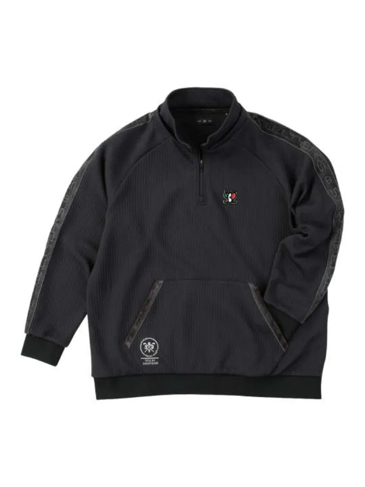 フード(調節ひも有・取り外し可)/ハーフジップ/カンガルーポケット/裾スナップボタン(バック左サイド)/リブ(裾・袖口)/ラグラン袖/刺繍/プリント/保温