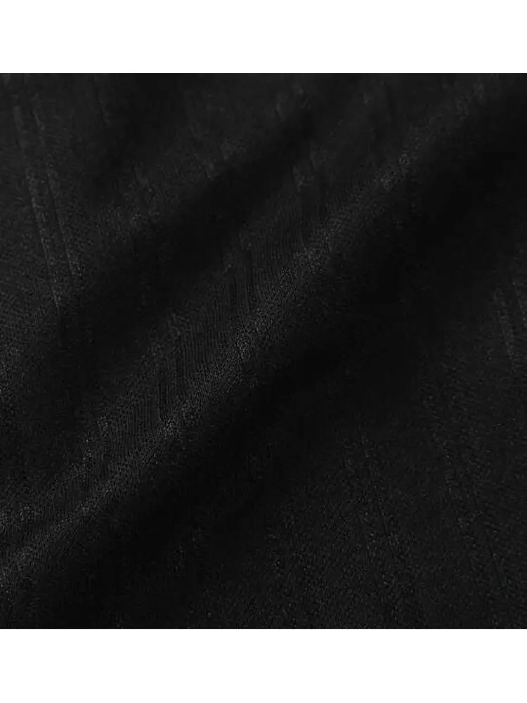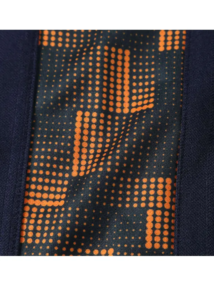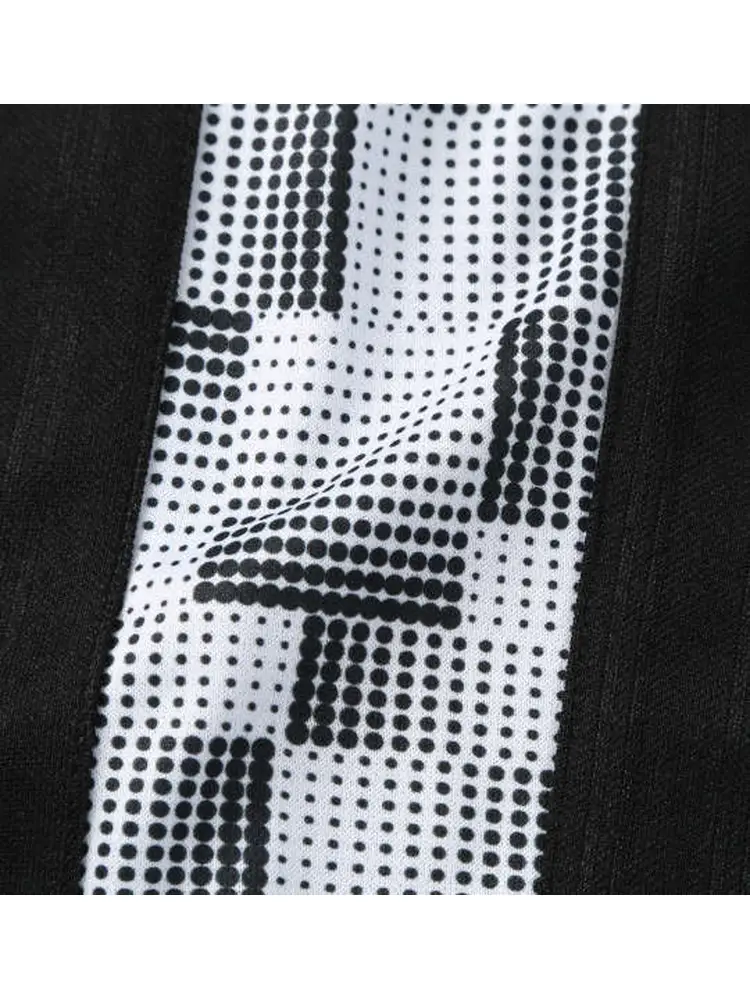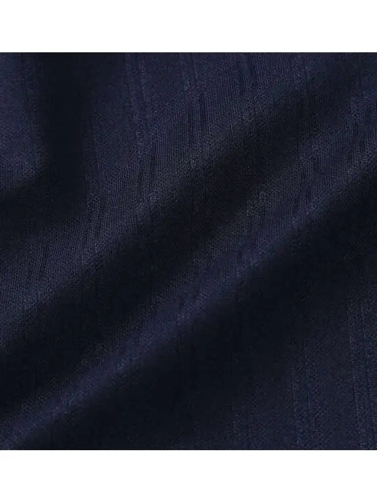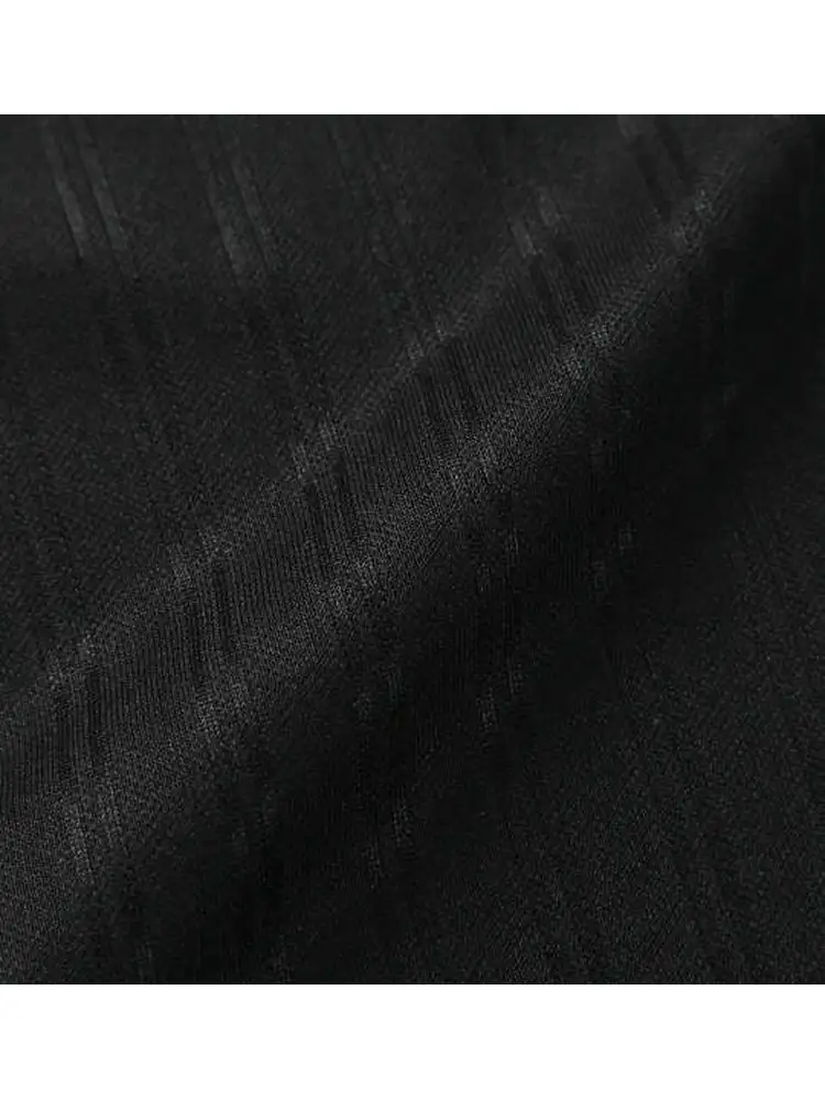 光の当たり方でストライプ柄が浮かび上がるベース生地と、サイドに施したドットプリントが縦ラインを強調。