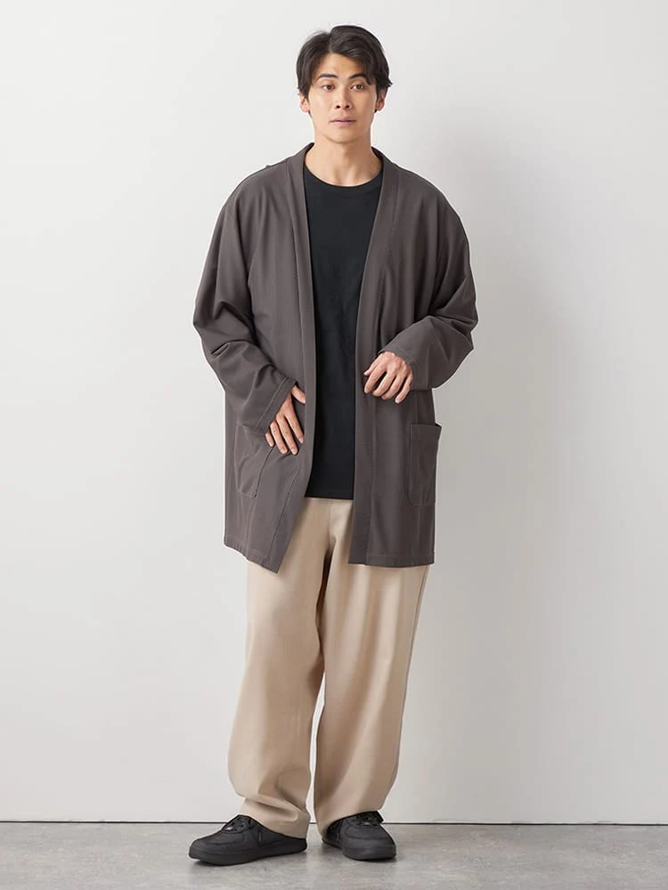 やや長めの裾丈で大人感があり、季節の変わり目にはライトアウターとしての着用も可能です。