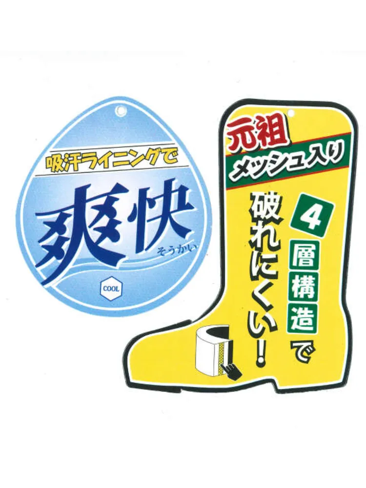 完全防水仕様に加え、「ナイロン」「ゴム」「メッシュ」「ゴム」の4層構造になっているため、一般的なゴム1層の長靴と比べると胴体強度は約3倍!