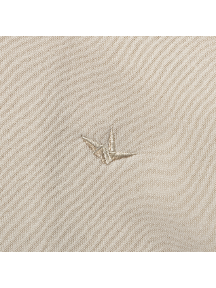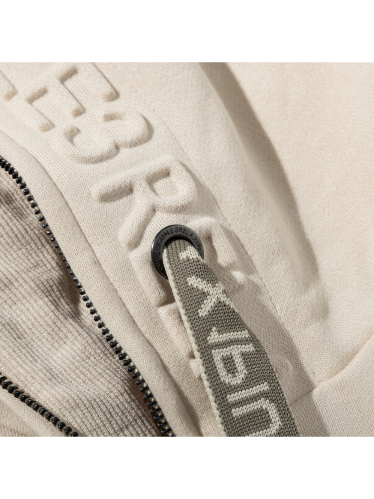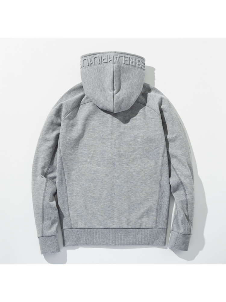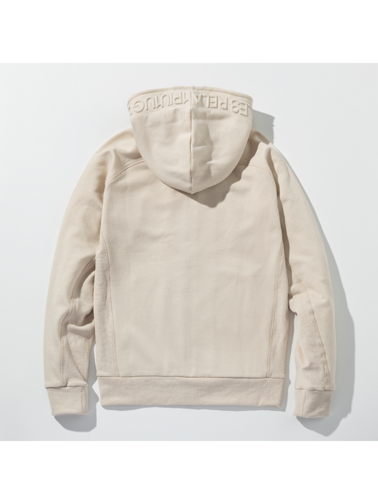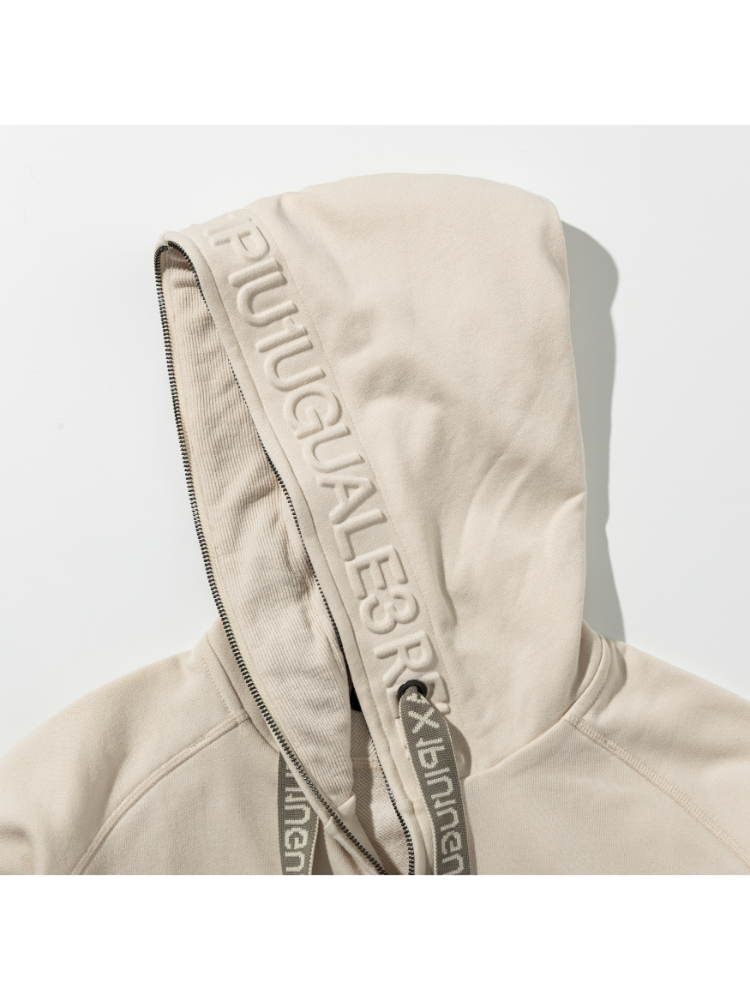 フードにあしらわれたエンボスロゴとドローコードのロゴデザインがさりげなく主張。